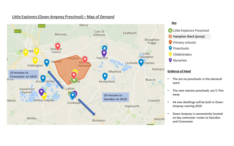 Great opportunity: There is no local preschool in Down Ampney and minimal other local childcare options meaning parents must travel to other larger settlements to access childcare. However, there is a clear opportunity to address this need as a perfectly good unused portacabin exists on the site of Down Ampney school, which could provide an ideal location for an early years setting for the local area.