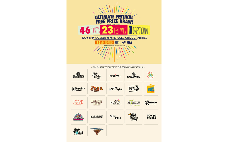 22 of the UK’s leading independent festivals have all come together with the aim of raising urgent funds and awareness for refugees in Northern France. They have all offered up a pair of festival tickets for the Ultimate Festival Prize Draw offering 22 lucky entrants the chance to win a pair of tickets to one of these incredible festivals.